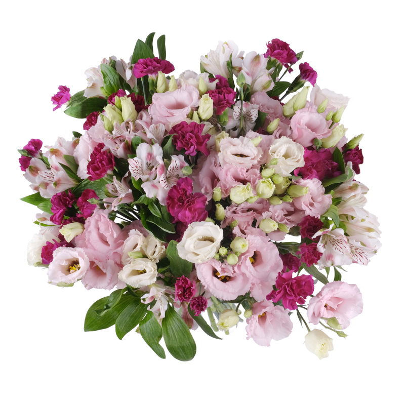 Miłosny List to kompozycja, w której eustoma i alstromeria nadają lekkości, a ciemniejszy goździk wprowadza wyrazisty ton. To bukiet z emocją.